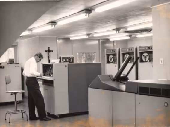 Pessoa opera um computador Burroughs. Na sala há leitoras de cartões perfurados e de fitas magnéticas