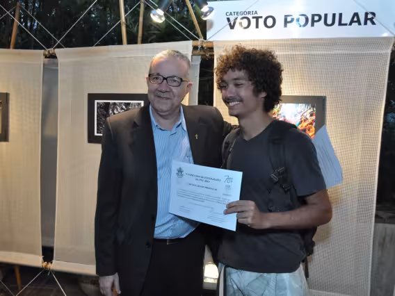 Alunos do Colégio Stockler tocam na mesa interativa da exposição.