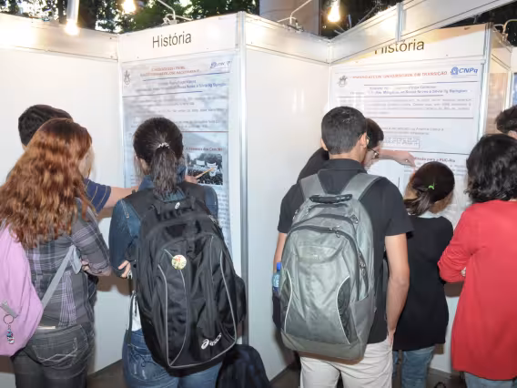 O professor Marco Antônio Pamplona e a avaliadora do CNPq, profa. Lorelai Kury, assistem a apresentação do bolsista de iniciação científica Pedro Vianna.