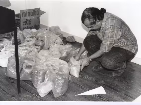 Exposição das telas do Padre José Maria Fernandes no Solar Grandjean de Montigny. Na foto, padre José Fernandes apresenta as amostras de terra do interior de Minas Gerais que usou para fazer as suas tintas.
