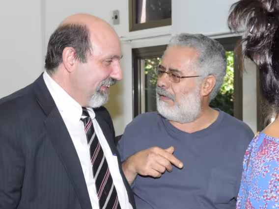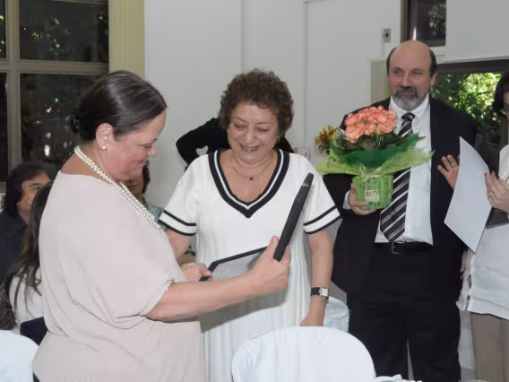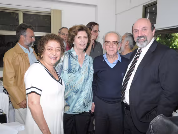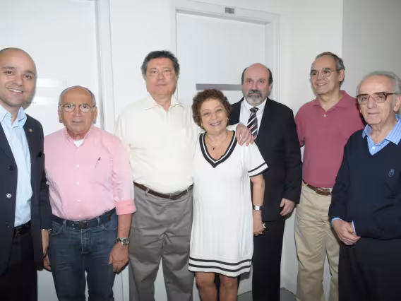 Mesa com palestrantes e ao fundo plateia presente no evento.