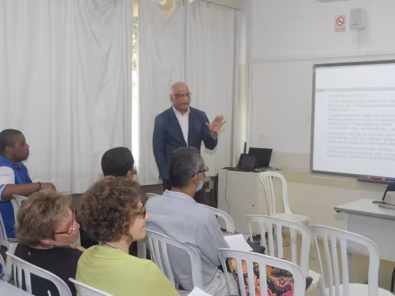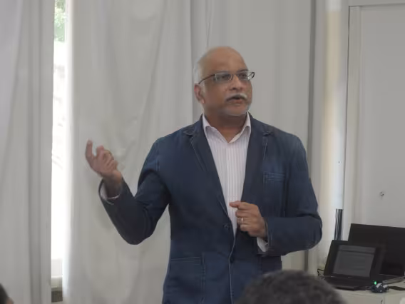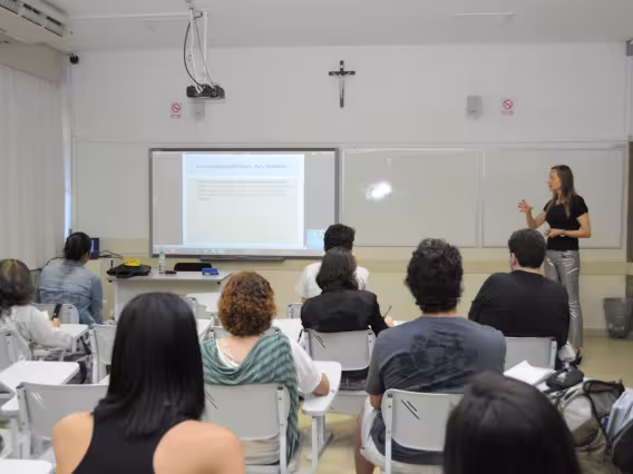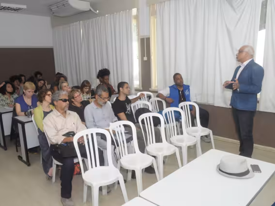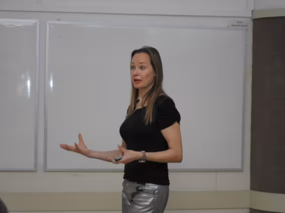 A professora Andrea Mayr, da Queen’s Belfast Universit, e plateia.