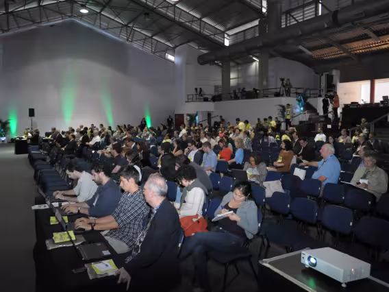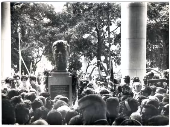 O senador Robert (Bob) Kennedy cercado pelo público presente à inauguração do busto de seu irmão, John Kennedy, nos pilotis do Edifício da Amizade.