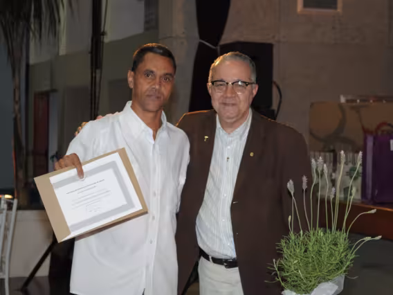 A funcionária Francisca Ferreira recebe o diploma de Honra ao Mérito do Reitor Padre Josafá S.J. em agradecimento aos 25 de dedicação à PUC-Rio.