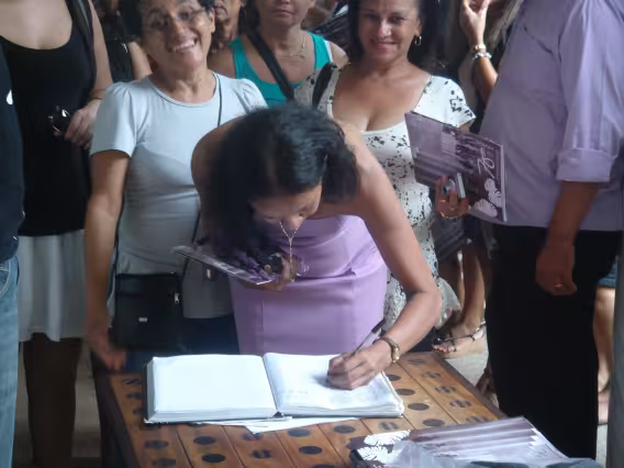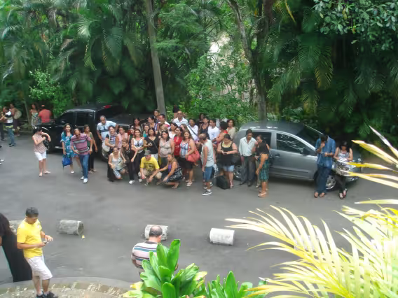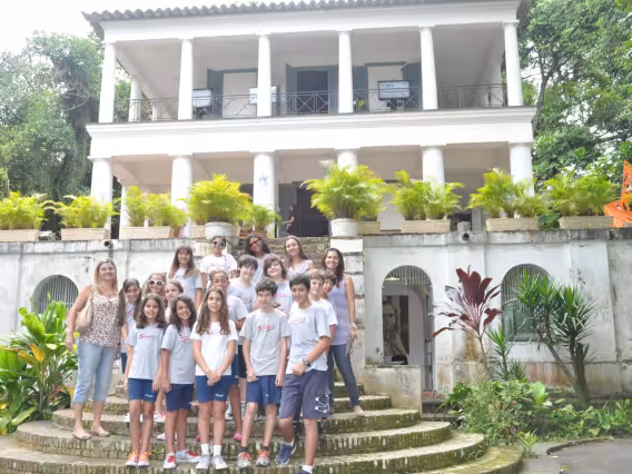 Retrato em grupo da professora Sônia Camargo com familiares e convidados.