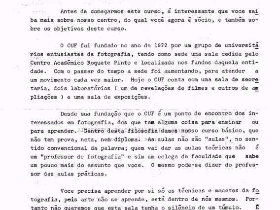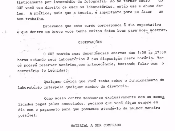 Folheto descritivo do curso básico de fotografia oferecido pelo CUF. Horário de funcionamento do CUF e lista do material a ser comprado para o curso.