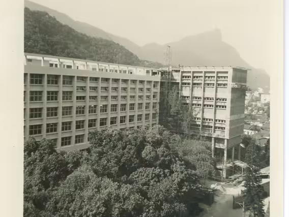 Edificio da Amizade, com a Ala Kennedy pronta e a Ala Frings ainda em obras, tendo ao fundo parte do Parque Proletário da Gávea e o morro do Corcovado.