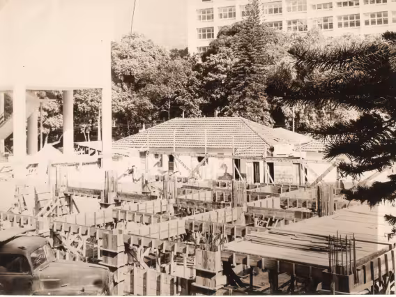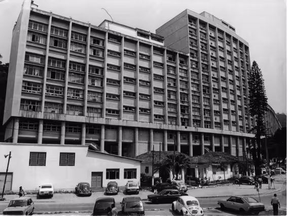 Vista da entrada do campus. À direita, a Ala Frings, ainda com escada de madeira, e à esquerda, o Edifício Cardeal Leme.