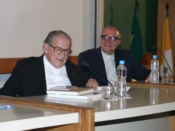 O Reitor pe. Hortal S.J. e Dom Geraldo deixam o auditório do RDC.