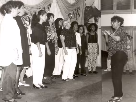 O VIII Encontro de Corais, coordenado pela maestrina Lydia Podorolski, foi realizado na PUC-Rio e contou com a presença de 25 corais filiados à Federação do Rio de Janeiro. Na foto Myrian Pitta rege o coral da IBM.