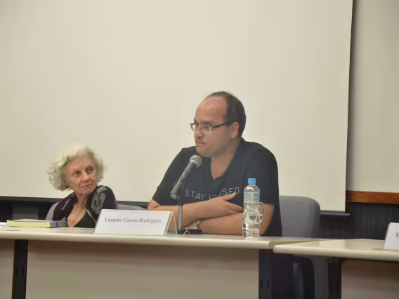 A professora de Comunicação Ítala Maduell e o jornalista Chico Felitti, do BuzzFeed na palestra sobre jornalismo investigativo, promovida pelo Departamento de Comunicação Social.