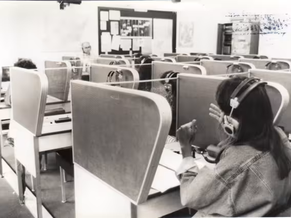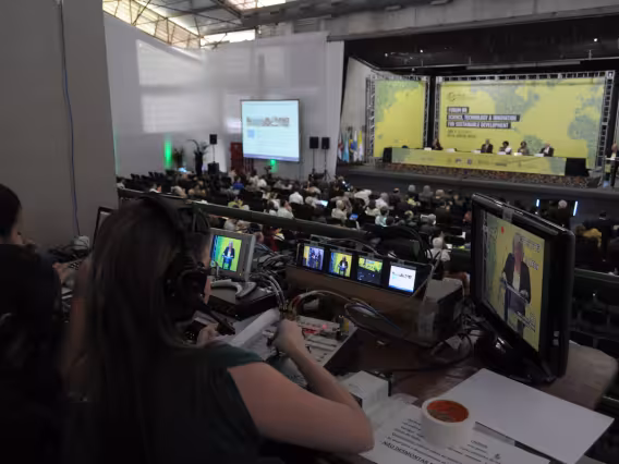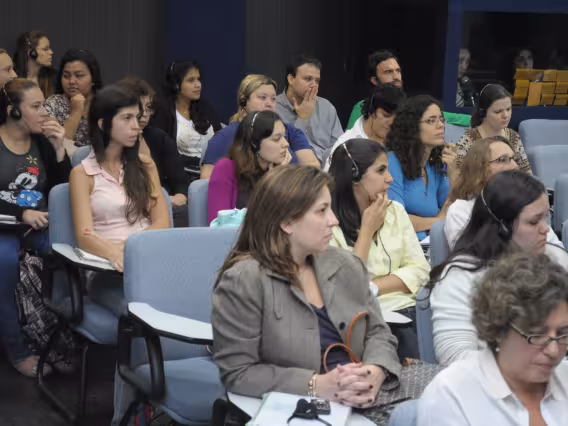 A profa. Margarida acompanha a visita do Reitor Pe. Josafá S.J. à exposição "Gávea - Território de Diversidades, Morada de Contradições". Ao lado, o funcionário Clóvis Gorgônio e Wanderlucy Bezerra assistem os vídeos do projeto Memória Rocinha.