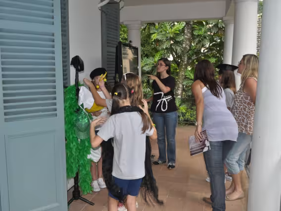 A monitora da exposição, Juliana Farias, auxilia a aluna do Colégio Stockler a fazer um registro fotográfico para a exposição.