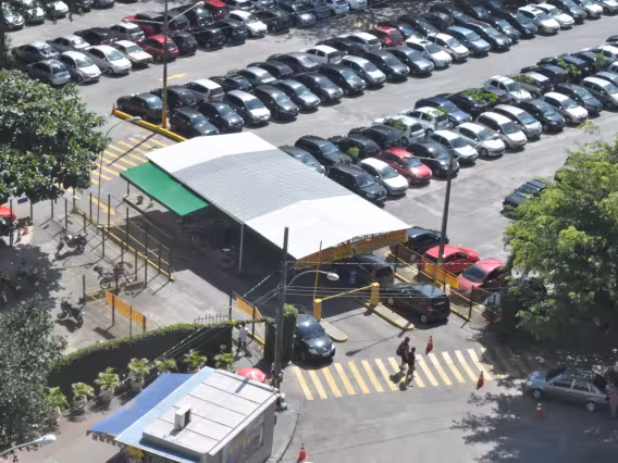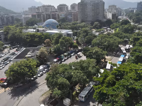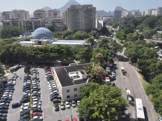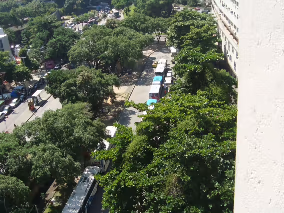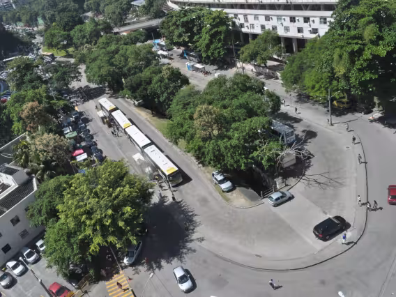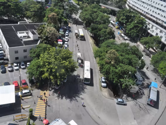 Terminal de ônibus localizado em frente à entrada do campus Gávea da PUC-Rio. Instituto Gênesis e Minhocão. Vista do alto da Ala Frings.