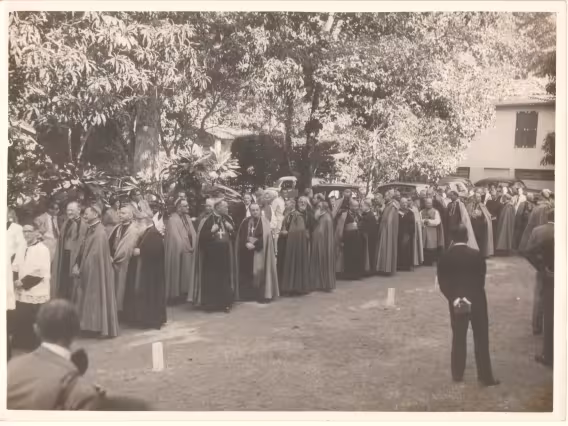 Parte do meio ao final do Edifício Cardeal Leme, com carros estacionados e movimentação de alunos e fuincionários.