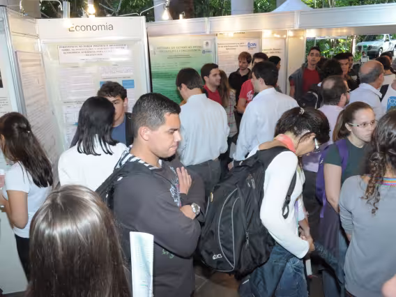Bolsistas de iniciação científica do Departamento de História durante a apresentação de posters sobre suas pesquisas.