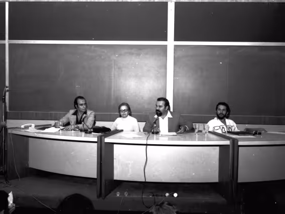 Código exclusivo ls0011_026 Coleção II Encontro Nacional de Professores de Literatura Data de criação 01/08/1975 Natureza do documento imagem Tipo de documento negativo PB Descrição Mesa com palestrantes.