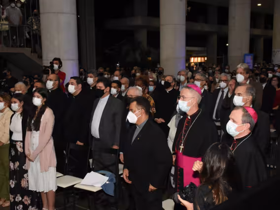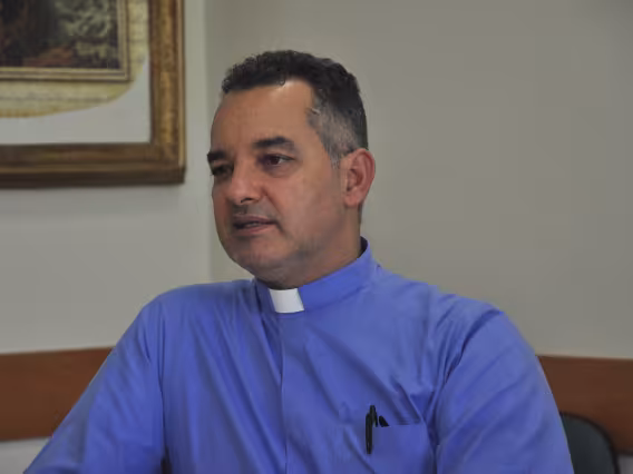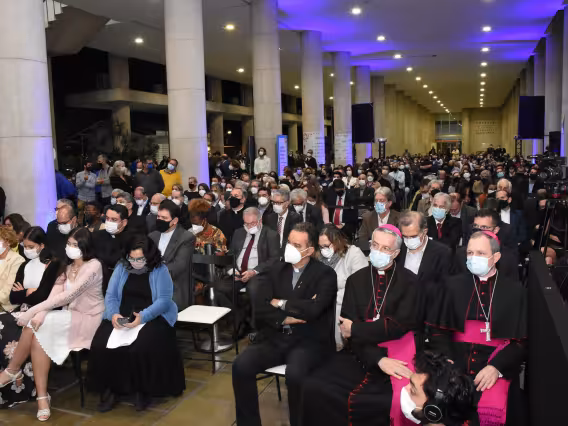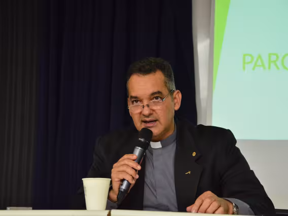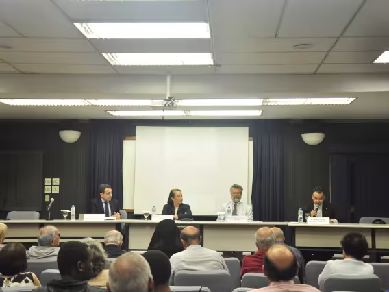 O professor Antonio Carlos de Oliveira, do Departamento de Serviço Social; o diretor do Departamento de Teologia, padre Waldecir Gonzaga, Monsenhor Manoel de Oliveira; o coordenador da Pastoral Universitária Anchieta, padre José Abel de Souza S.J e a assessora da vice reitoria comunitária e integrante da Comissão de Trabalho do Programa Sustentabilidade Humana, Social e Ambiental, Andreia Paiva na mesa sobre Compromisso Social: o convênio entre a PUC-Rio e a Arquidiocese do Rio de Janeiro para a expansão Comunitária, na Semana das Comunidades.