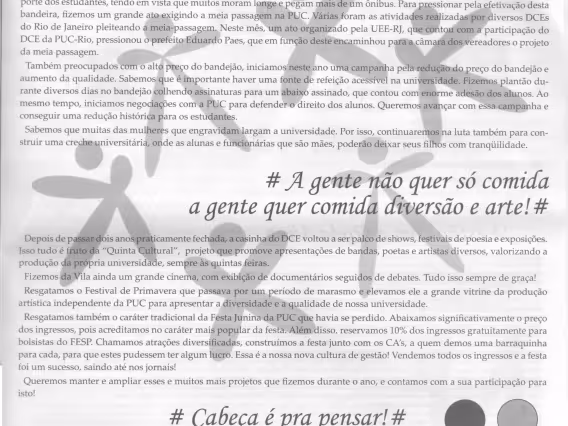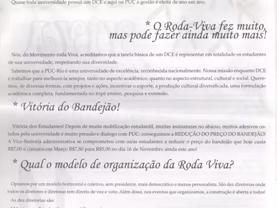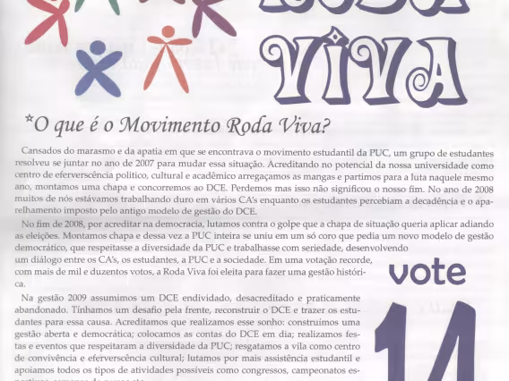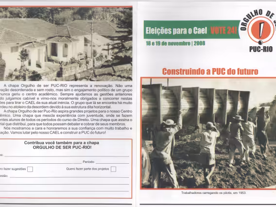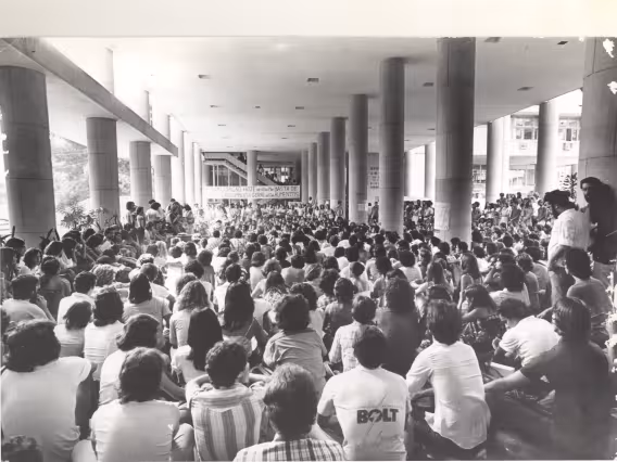 Fotografia publicada em matéria do Jornal do Brasil publicada em 29/03/1977 intitulada "Assembléia de mil alunos da PUC decide greve para hoje contra preço e punições". A matéria destaca que os alunos da PUC-Rio, reunidos em assembleia em 28/03/1977, convocaram greve geral para o dia 29/03/1977 depois de receberem da Reitoria respostas negativas para três reivindicações: rebaixamento das anuidades no mesmo valor de 1976; revogação da suspensão de quatro alunos que, segundo relato do Reitor Pe. João MacDowell S.J., foram suspensos porque houve "tentativa de barrar aos colegas acesso à tesouraria, desacato a professores e insultos públicos"; e relaxamento das multas de 5% sobre mensalidades pagas em atraso.