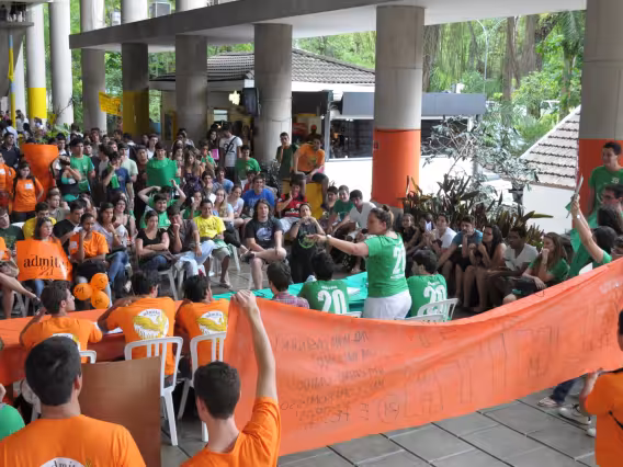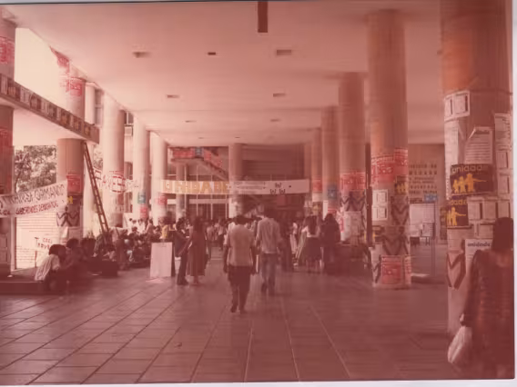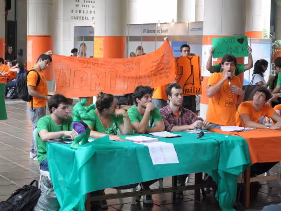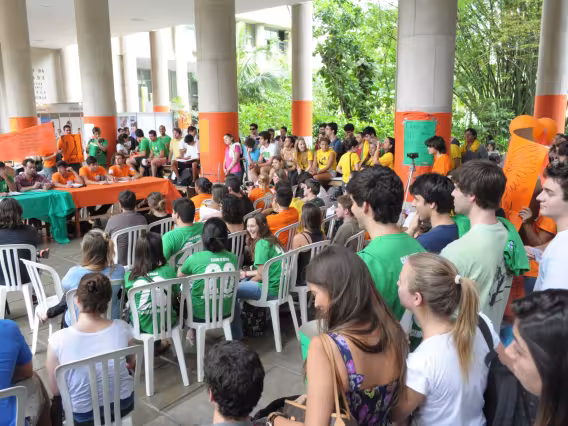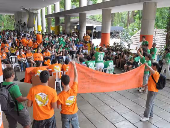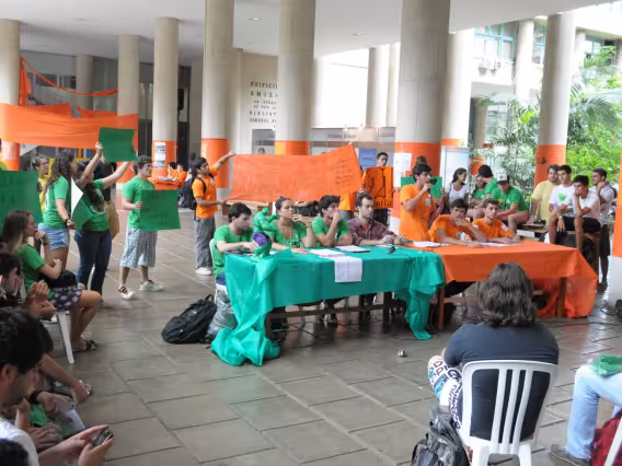 Imagens da campanha eleitoral para o DCE e centros acadêmicos. Faixas e cartazes das chapas concorrentes.
