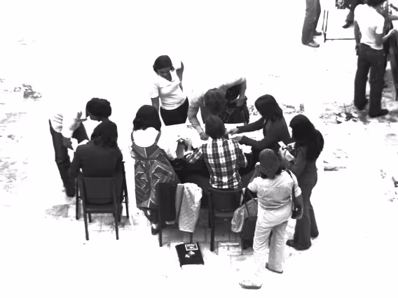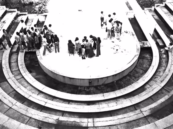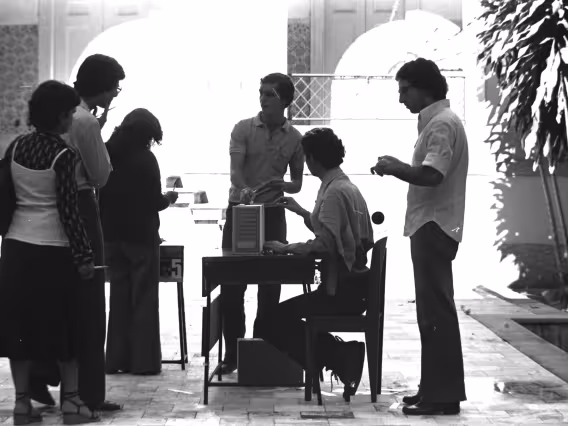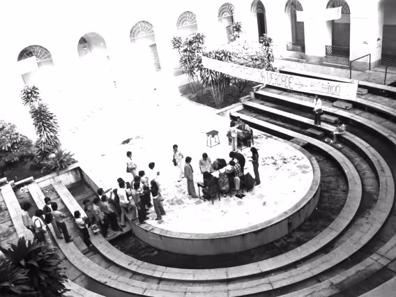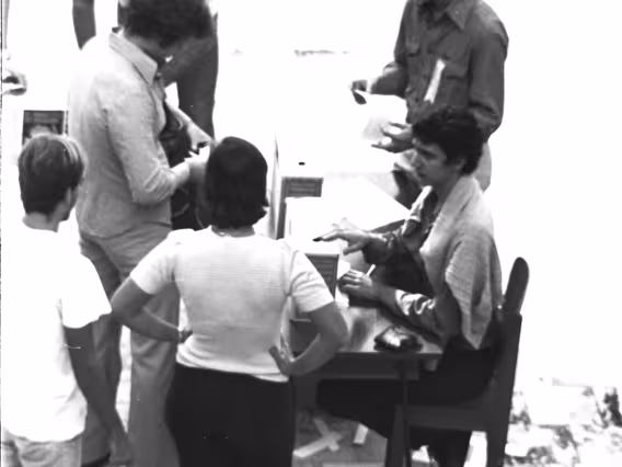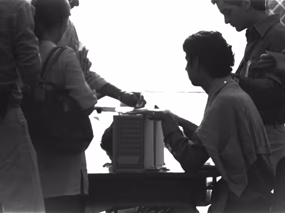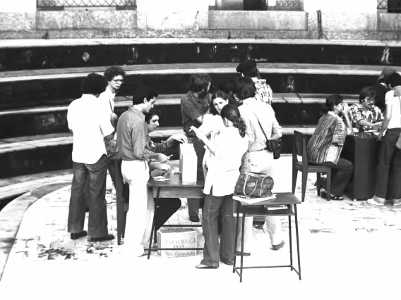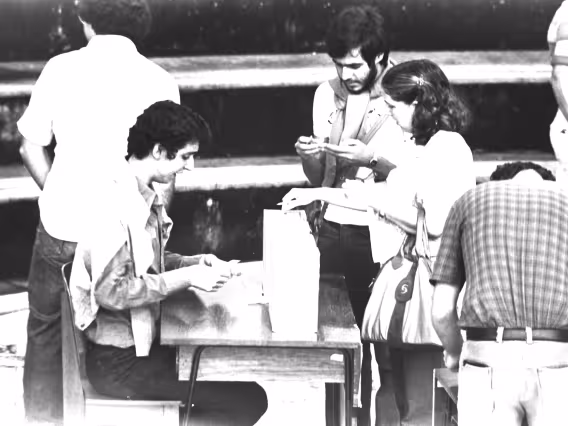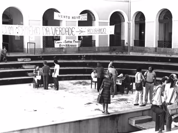 Eleições para UNE e UEE, no anfiteatro da Faculdade de Economia, Praia Vermelha, UFRJ. Mesas de votação. Faixas das chapas Vento Novo e Revirando.