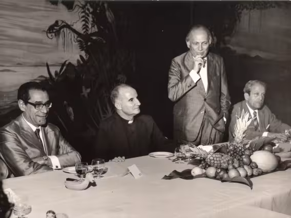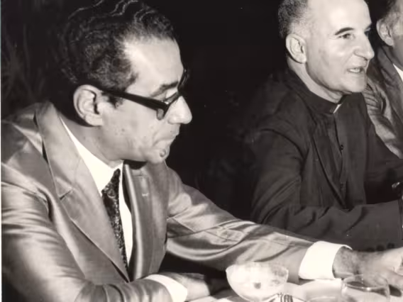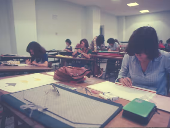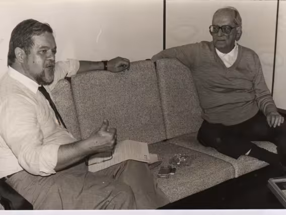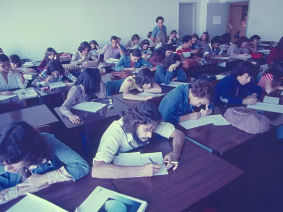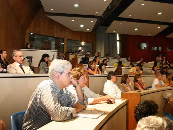 O prof. Affonso Romano de Sant'Anna em aula com alunos na Sala de Mestrado do, à época, Departamento de Letras e Artes.