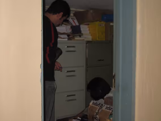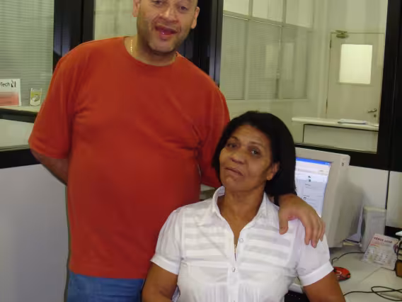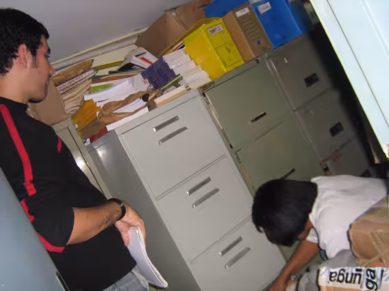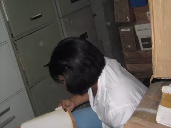 Pesquisador do Núcleo de memória e secretária do Departamento de História analisando um documento do acervo do Departamento.