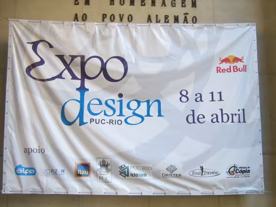 Pilotis cheio de pessoas, com banners comemorativos dos 70 anos da PUC-Rio.