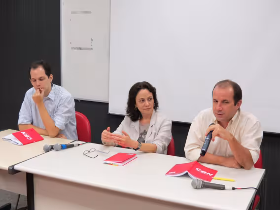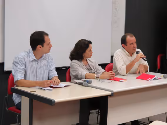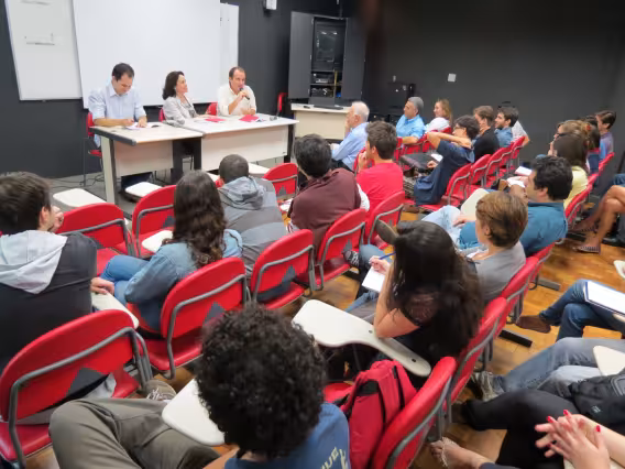 As jornalistas Bia Guimarães e Sarah Azoubel, produtoras e apresentadoras do podcast 37 graus, e os professores Julio Lubianco e Creso Soares, do Departamento de Comunicação Social na palestra sobre técnicas de produção, construção de narrativas e busca por financiamento do podcast.