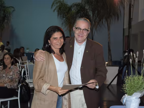 A professora Maria Isabel recebe do Reitor Padre Josafá S.J. o diploma de Honra ao Mérito em agradecimento aos 25 anos de dedicação à PUC-Rio.