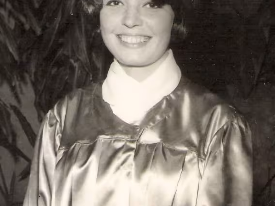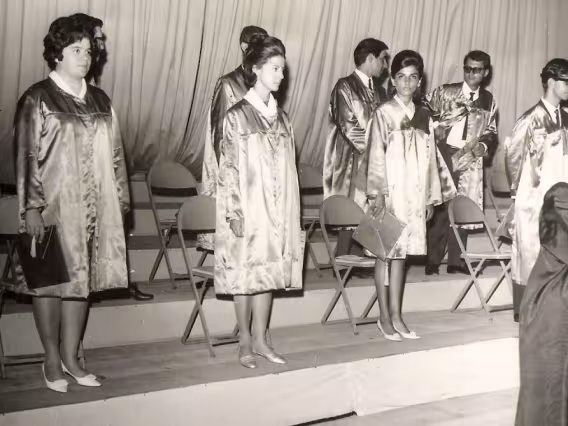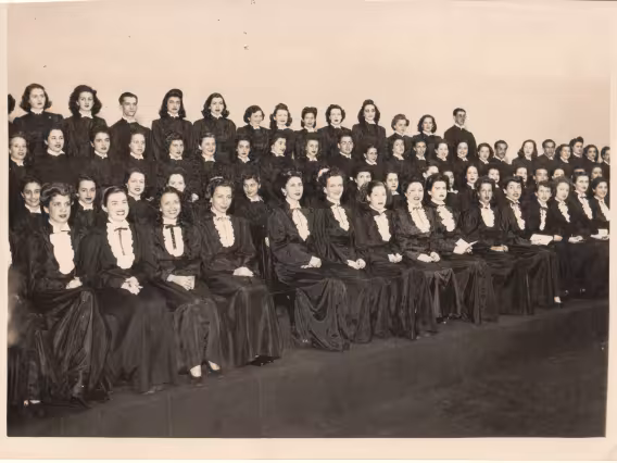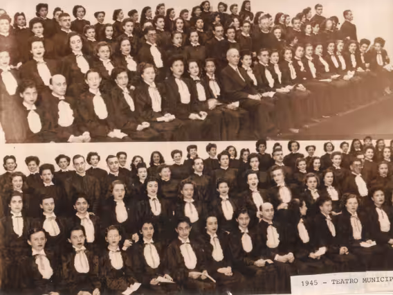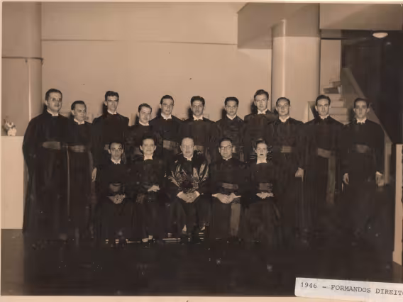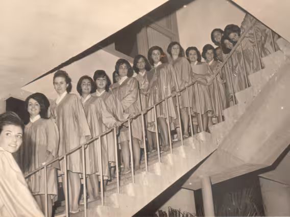 Alunas de beca posam numa das escadas do Edifício Cardeal Leme. Parece haver apenas um homem, no fundo, no alto da escada.