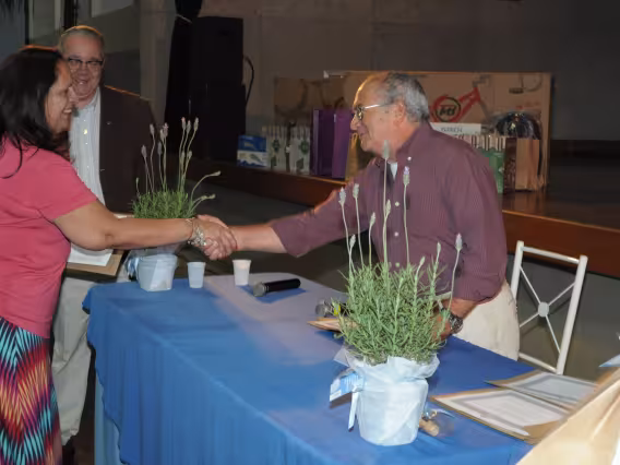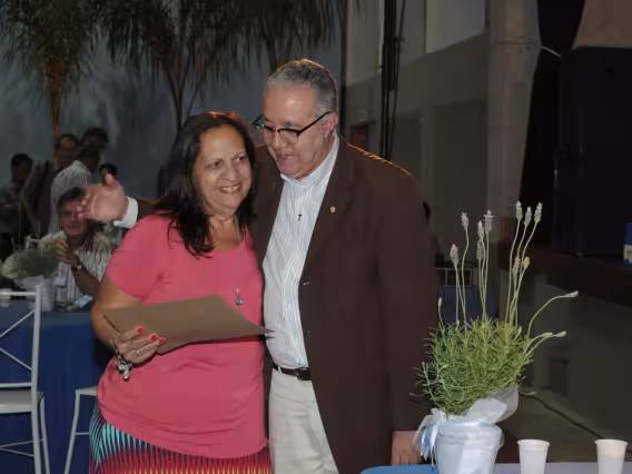 A funcionária Ana Lúcia da Silva recebe os cumprimentos do Vice-Reitor Comunitário, prof. Augusto Sampaio, em agradecimento aos 25 anos de dedicação à PUC-Rio.