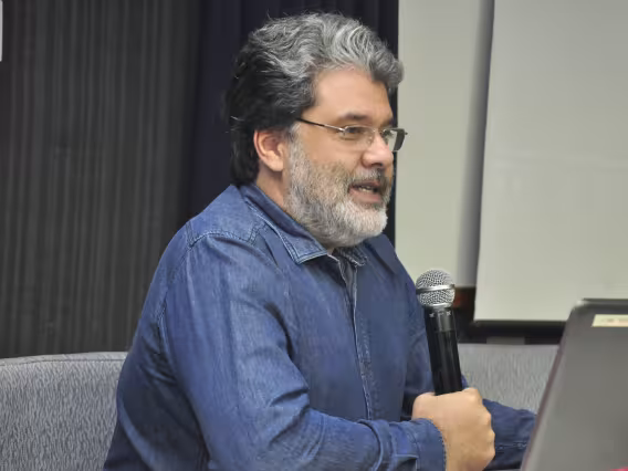 Alexandre Mountary Baptista Coutinho, diretor do Departamento de Letras; Paolo Miraglia Del Giudice, Cônsul-geral da Itália e o professor Renato Lessa, do Departamento de Direito, na abertura do colóquio sobre Centenário do escritor italiano Primo Levi.