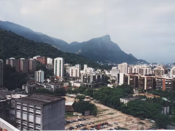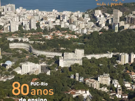 Foto do alto do edifício Cardeal Leme, a partir da varanda do Decanato do CTC. Vista do estacionamento externo, com automóveis e ônibus, o Laboratório de Desenvolvimento de Protótipos do Departamento de Artes. Vista de parte do bairro da Gávea.