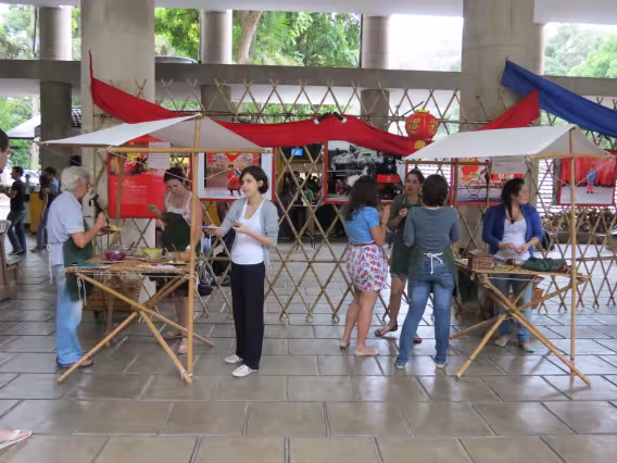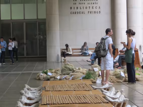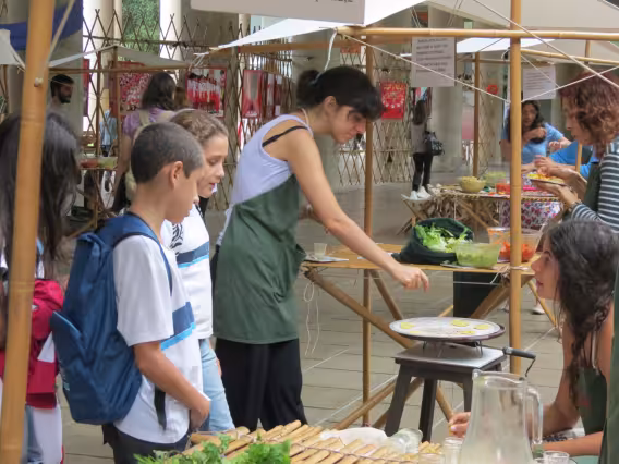 Alimentos cultivados pelos alunos expostos nos pilotis.