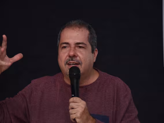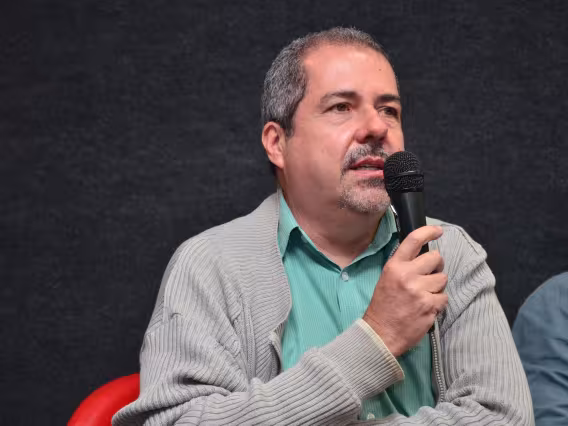Chico Otávio, professor do Departamento de Comunicação Social na mesa 12 falando sobre o tema de dados e fontes jornalística.