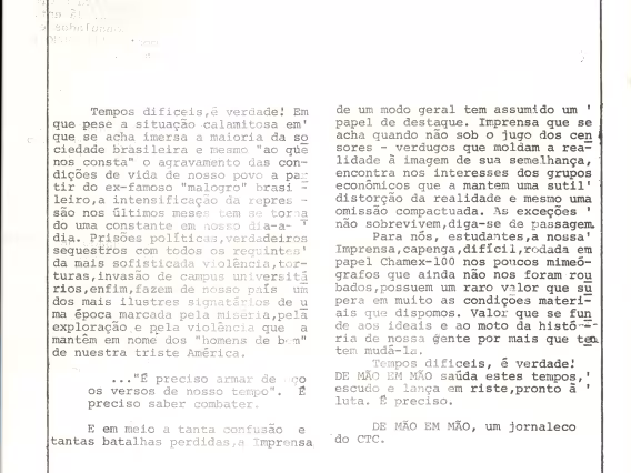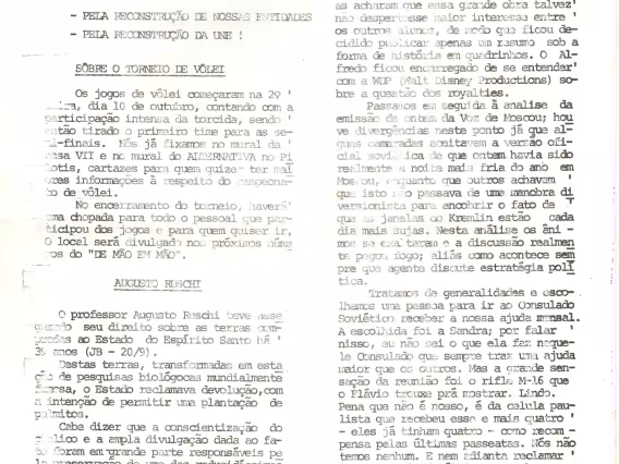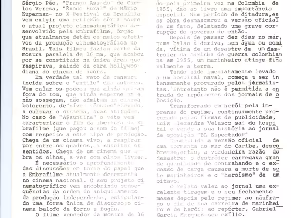 Artigos: censura em Brasília e Gabriel Garcia Marquez. Jornal da chapa Alternativa, do CTC, do movimento estudantil da PUC-Rio, sem número.
