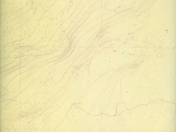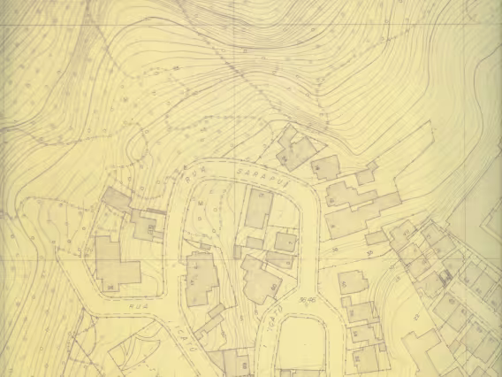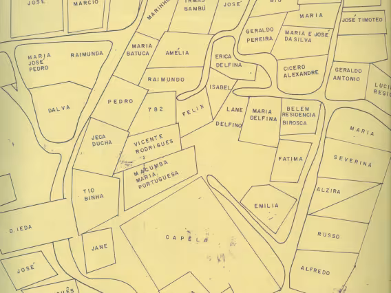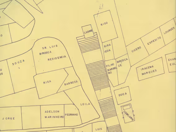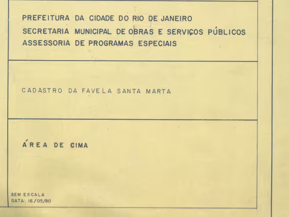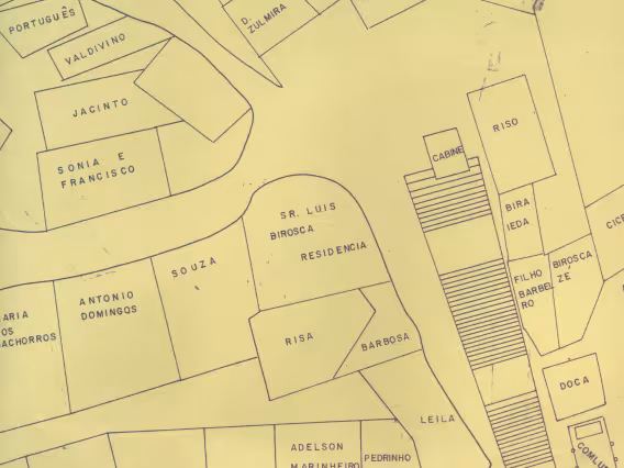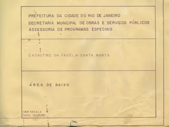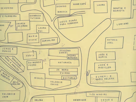 Mapa esquemático do Morro Santa Marta. Indicação das casas com nomes dos moradores. Alguns nomes: Maria Grande, Zequinha Juquinha, Chico Caroço, José Mindo, Dorinha e Manesinho, Mane Café, Chico Romão Para Sobrinha, Quimbuca Tutinha, Maria do Zinha, Zuinha, João e Maria Bahiana.