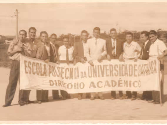 Código exclusivo cg0077_052 Coleção Acervo do Prof. Paulo Novaes - Vice-reitoria de Desenvolvimento - parte 4 Data de criação 01/01/1950 Natureza do documento imagem Tipo de documento fotografia PB Descrição Alunos do Diretório Acadêmico da Escola Politécnica da Universidade Católica seguram uma faixa.