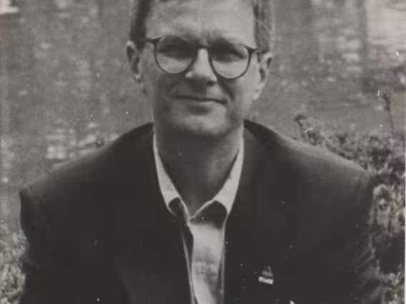 Fotografia do professor Robert Schwartz, da Universidade de Huston (EUA), publicada no Jornal da PUC em matéria sobre a visita de professores americanos ao Departamento de Comunicação Social da PUC-Rio.