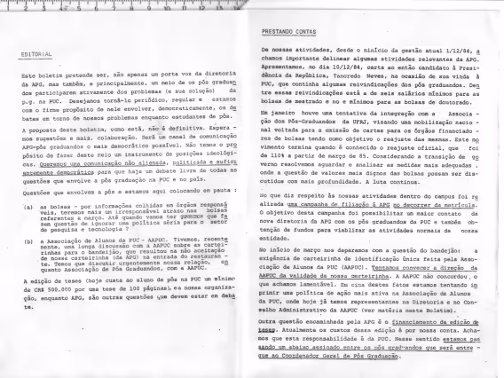 p.1 e 2 - Editorial. Prestando contas. Associação de Alunos da PUC-Rio (AAPUC). Financiamento à edição de teses.