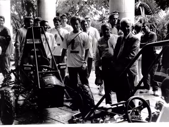 Professores Augusto Sampaio e pe. Pedro Magalhães Guimarães Ferreira S.J. visitam os protótipos de automóveis em miniaturas com simulador de movimento, projeto coordenado pelo prof. Mauro Speranza Neto do Curso de Engenharia de Controle e Automação.