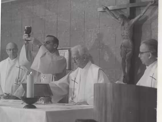 O prof. pe. Pedro Magalhães S.J. faz a leitura da entrega do título de Doutor Honoris Causa a Dom Helder Pessoa Camara na Missa de Ação de Graças que celebrou o Jubileu de Ouro da PUC-Rio.