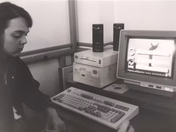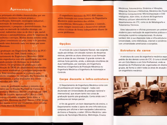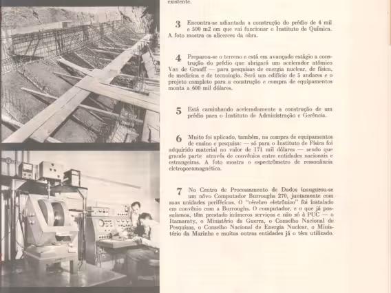 Página do folder de divulgação da Campanha Financeira "Seja mais uma coluna da PUC". Balanço do que foi realizado entre 1963, quando houve uma grande campanha financeira, e 1966. Fotos de diversos pontos do campus Gávea, prontos ou em obras: Biblioteca Central, Prédio do Van de Graaff, Instituto de Física, Edifício da Amizade, computador Burroughs B270.