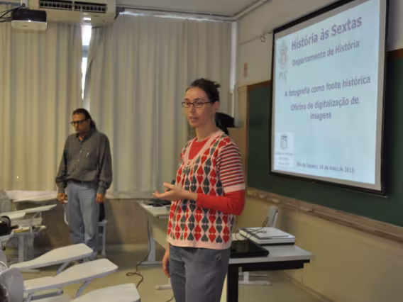 Os pesquisadores Clóvis Gorgônio e Silvia Ilg apresentam a oficina do Núcleo de Memória da PUC-Rio.