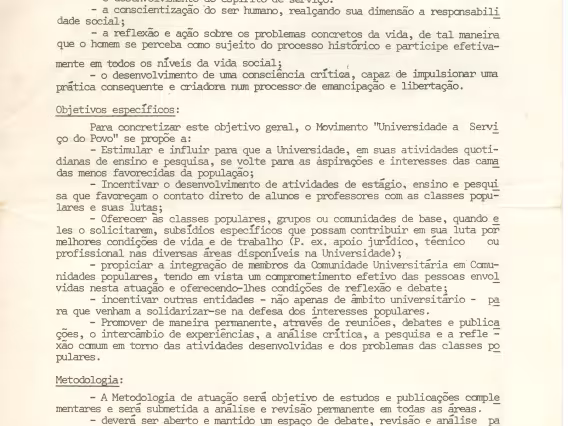 Página 02. Objetivos gerais e específicos do Movimento Universidade a Serviço do Povo, e sua metodologia.