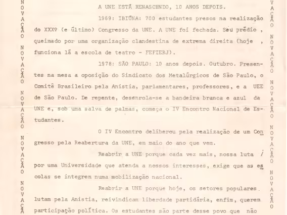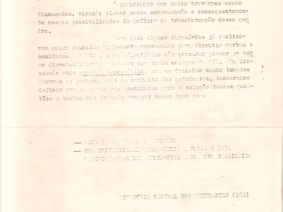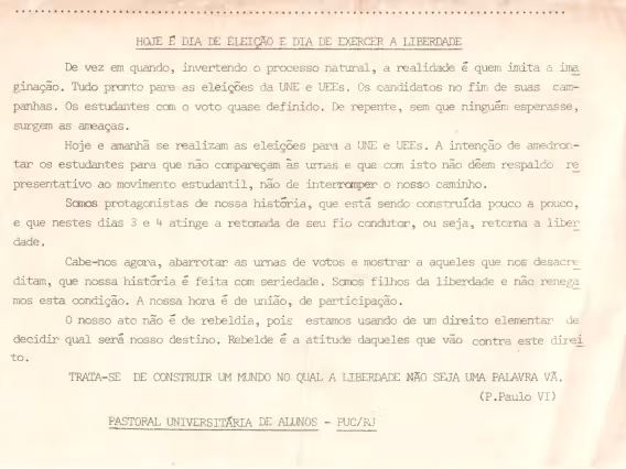 Convocação para as eleições da UNE e das UEEs pela Pastoral Universitária de Alunos da PUC-Rio. Fala sobre ameaças ao processo de votação.