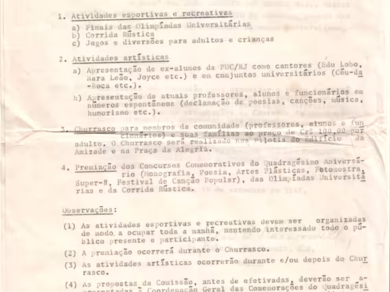 Programação da festa comunitária pelo comemoração dos 40 anos da PUC-Rio, incluindo: atividades esportivas, recreativas e artísticas, churrasco e premiação de concursos. Previstos: apresentação de ex-alunos como Edu Lobo, Joyce, Nara Leão e Céu da Boca; churrasco; premiação dos concursos de monografia, poesia, artes plásticas, fotomostra, super-8 e do Festival de Música.