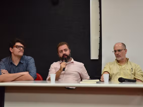 Lucas Ragazzi e Murilo Rocha, autores do livro-reportagem Brumadinho: a engenharia de um crime e a cobertura da imprensa sobre a tragédia, em palestra com o prof. Eduardo Pegurier (ECO).