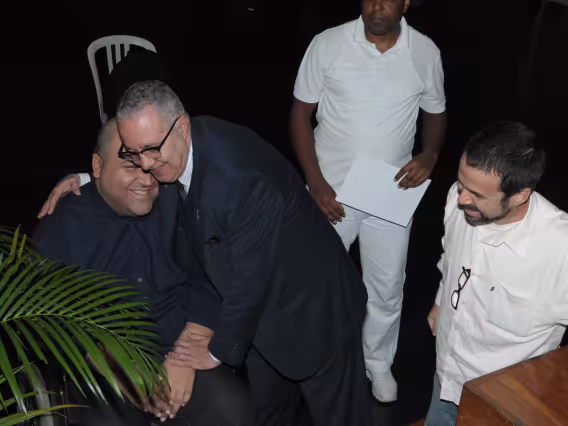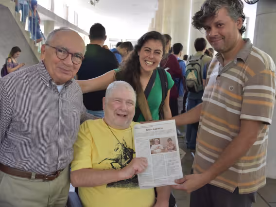 Encontro casual do prof. Augusto Sampaio (VRC) com o prof. Silvio Tendler (COM) no hall dos elevadores da Ala Kennedy.